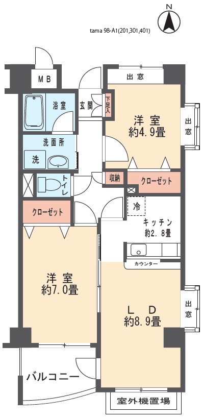 部屋 南向き、出窓あり、モニター付きインターホン、収納、CATV、追い焚き機能、バス・トイレ別、室内洗濯機置き場、洗面所独立、カウンターキッチン